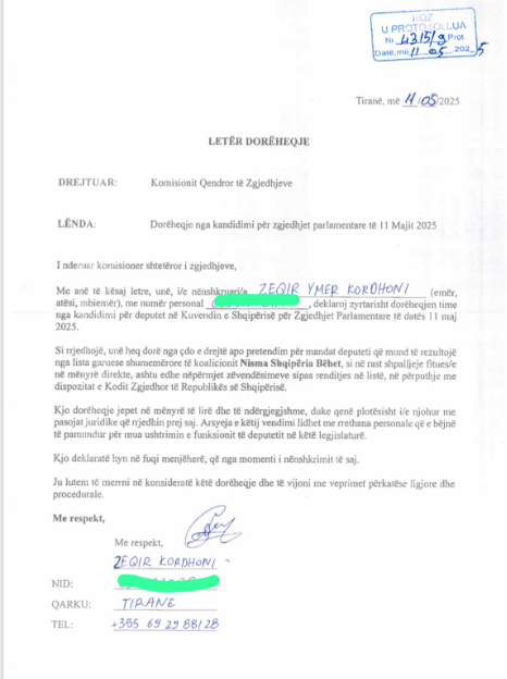 Pas zgjedhjeve, “Nisma- Shqipëria Bëhet” ka dorëzuar dorëheqjet e emrave në listë të mbyllur, mes tyre edhe Zeqir Kordhoni.