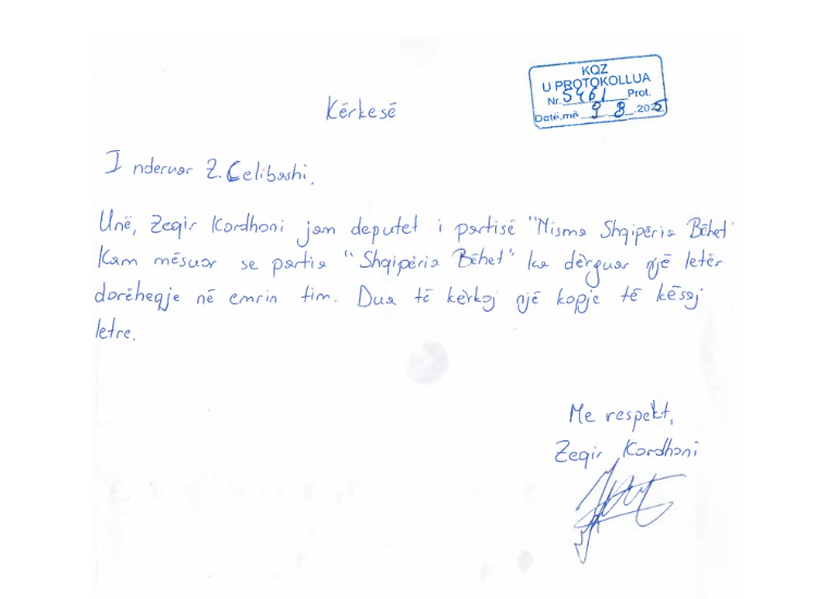 Kordhoni nuk është më i bindur për lënien e mandatit dhe i është drejtuar KQZ-së me një letër me shkrim dore, ku e cilëson veten deputet dhe kërkon kopje të dorëheqjes së tij. Në një letër drejtuar kreut të KQZ, Ilirjan Celibashi ai kërkon një kopje të dorëheqjes së tij.