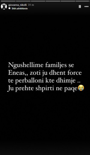 “Ngushëllime familjes së Eneas. Zoti ju dhëntë forcë të përballoni këtë dhimbje…Ju prehtë shpirti në paqe”, shkruan Xhovana Nikolli në Instastory.