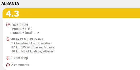 Sipas të dhënave të para, lëkundjet ishin me magnitudë 4.3 ballë të shkallës Rihter dhe me thellësi 13 kilometra.