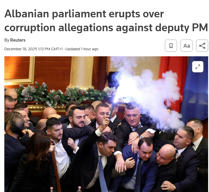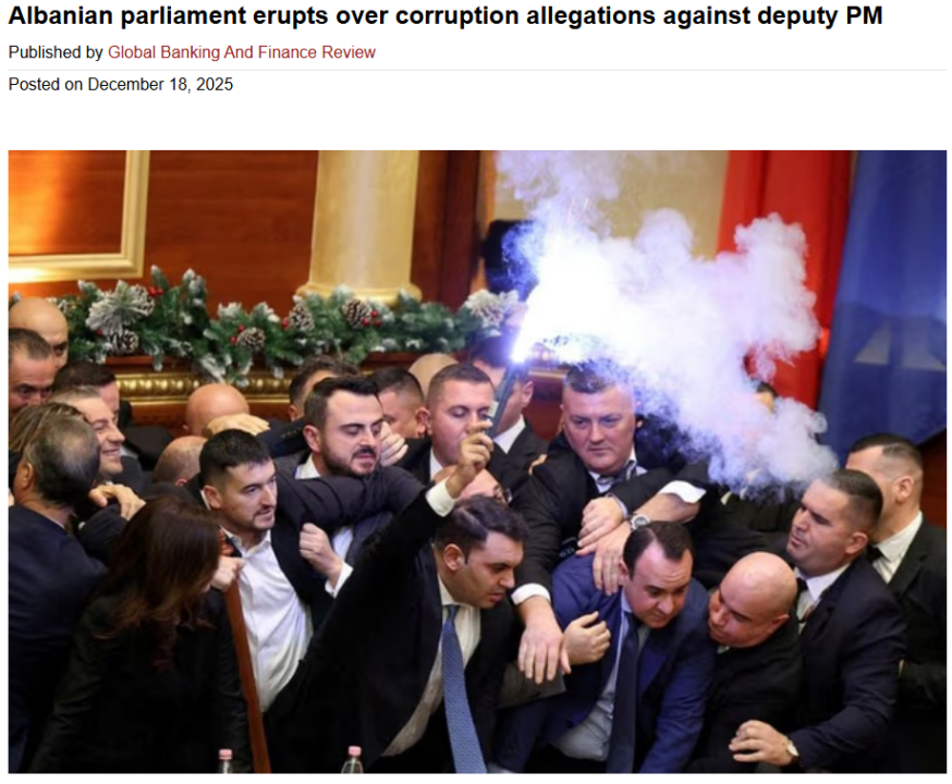 “Parlamenti shqiptar shpërthen në protesta për shkak të akuzave për korrupsion kundër zëvendëskryeministres”- është titulli i medias britanike “Global Banking & Finance review”, njësoj si “Reuters”.