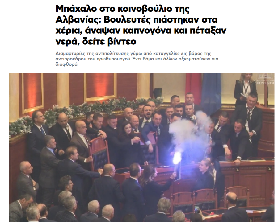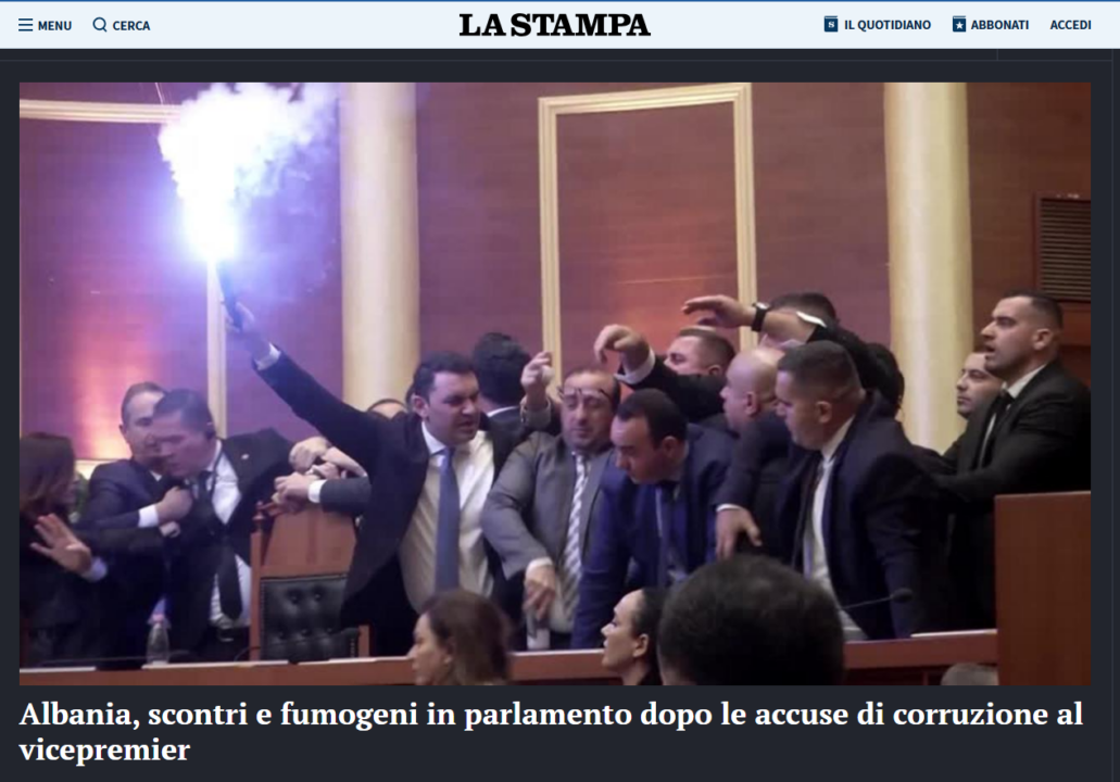 Media greke “Protothema” shkruan se “opozita protestoi sot në Kuvend për zëvendëskryeministren Belinda Balluku dhe zyrtarëve të tjerë të akuzuar për korrupsion”. Edhe “La Stampa” në Itali i qëndron së njëjtës linjë, teksa shkruan: “Përleshje dhe flakadanë shpërthejnë në parlamentin e Shqipërisë pas akuzave për korrupsion kundër zëvendëskryeministres”.