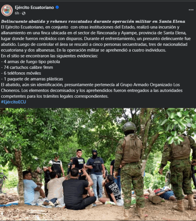 Ushtria ekuadoriane, në bashkëpunim me institucione të tjera shtetërore, bastisi një fermë të vendosur në zonën Rinconada dhe Ayampe të provincës Santa Elena, ku u prit me të shtëna. Gjatë përleshjes, një i dyshuar si kriminel u vra. Pas kontrollit të zonës, pesë persona të rrëmbyer u shpëtuan: tre ekuadorianë dhe dy shqiptarë. Katër persona u arrestuan në operacionin ushtarak.