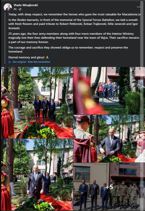 Në kazermat e Ilindenit, para memorialit të Batallionit të Forcave të Posaçme, vendosëm një kurorë me lule tdhe nderuam Robert Petkovskin, Boban Trajkovskin, Mile Janevskin dhe Igor Kosteskin. 25 vjet më parë, katër anëtarët e ushtrisë, së bashku me katër anëtarë të tjerë të Ministrisë së Brendshme, humbën tragjikisht jetën duke mbrojtur atdhenë e tyre afër qytetit të Vejçes. Sakrifica e tyre mbetet një pjesë e kujtesës sonë përgjithmonë. Guximi dhe sakrifica që ata treguan na obligojnë të kujtojmë, respektojmë dhe ruajmë atdhenë. Përjetësisht kujtim dhe lavdim”-shkruan ministri teksa ndan fotot e memorialit.