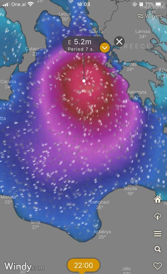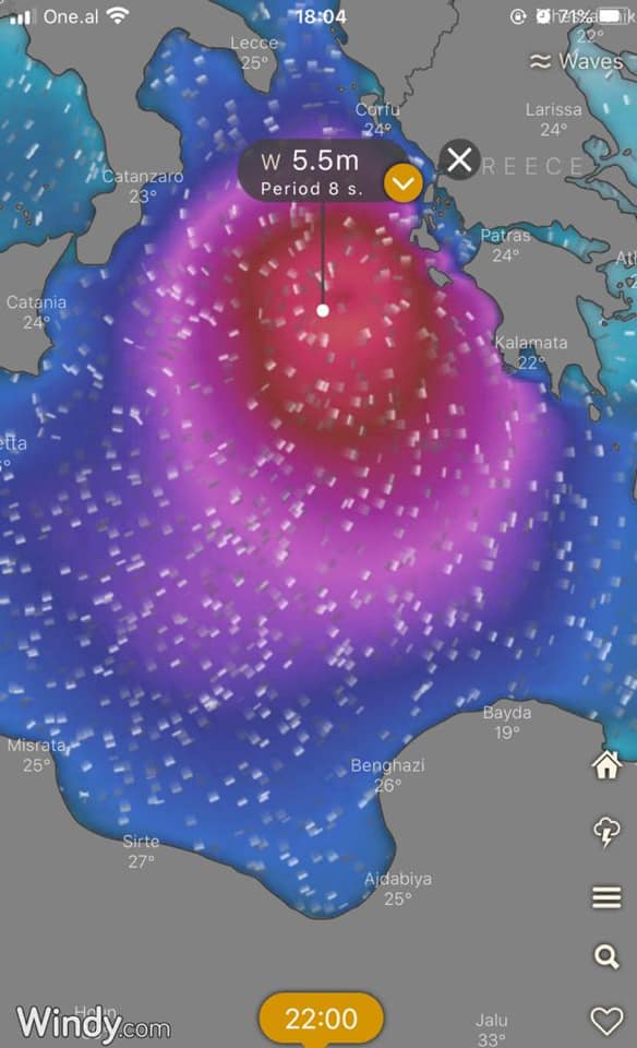 Moti i përkeqësuar do të ketë në jug të Italisë do të vazhdojë në drejtim të lindjes më konkretisht në zonën e Greqisë. Këto zona do të përfshihen nga era me shpejtësi deri në 60 milje në orë dhe lartësia e dallgës së detit arrin në 5.5m dhe perioda 8s . Ditën e premte dhe të shtunë vendi ynë do të përfshihet nga era me drejtim veri, veri-perëndim, veri-lindje.