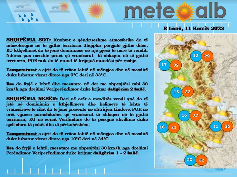 Kushtet e qëndrueshme atmosferike do të mbizotërojnë në të gjithë territorin shqiptar përgjatë gjithë ditës, ku kthjellimet do të jenë dominuese në një pjesë të mirë të vendit.