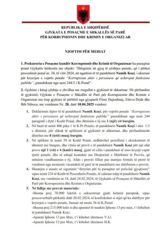 GJKKO ka dënuar me 8 muaj burg 43-vjeçarin Naim Koçin, pronar i baxhos “Perla Bulmet”, pasi në shkurt të vitit 2024 tentoi që të korruptojë drejtorin e AKU-së Rajonale në Tiranë (Autoriteti Kombëtar i Ushqimit).