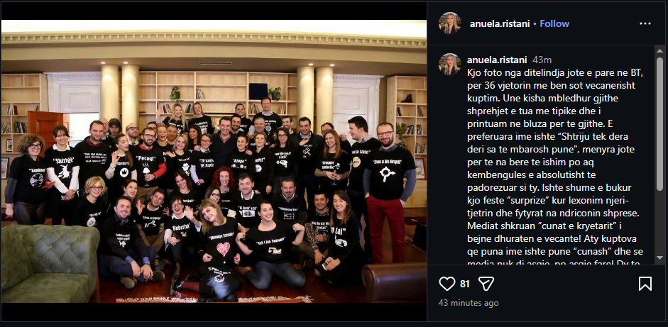 “Kjo foto nga ditëlindja jote e parë në BT, për 36-vjetorin, më bën sot veçanërisht kuptim. Unë kisha mbledhur gjithë shprehjet e tua më tipike dhe i printuam në bluza për të gjithë. E preferuara ime ishte: ‘Shtriju tek dera derisa të mbarosh punë’, mënyra jote për të na bërë të ishim po aq këmbëngulës e absolutisht të padorëzuar si ty. Ishte shumë e bukur kjo festë ‘surprizë’, kur lexonim njëri-tjetrin dhe fytyrat na ndriçonin shpresë. Mediat shkruan ‘çunat e kryetarit’ i bënë dhuratën e veçantë! Aty kuptova që puna ime ishte punë ‘çunash’ dhe se media nuk di asgjë, po asgjë fare! Dy të vërteta të pandryshueshme! Sot të kam në mendje si çdo ditë dhe urimi nuk i bën drejtësi shpresës që kam për ty!”, shkruan ajo.