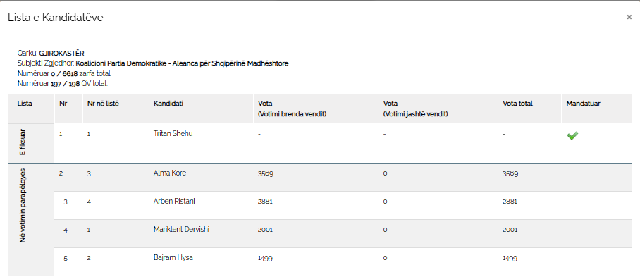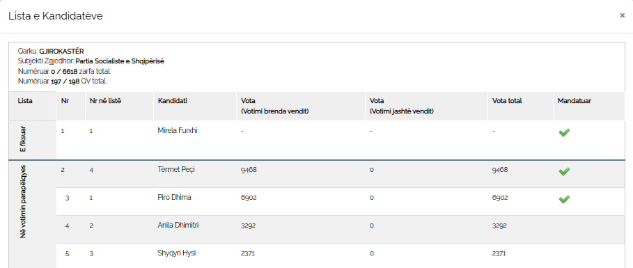 Në Qarkun e Gjirokastrës, ku ka përfunduar procesi, PS ka arritur të sigurojë 3 mandate deputetësh. Nga këta 1 është nga lista e sigurt, Mirela Furxhi, që del automatikisht si kandidat i votuar nga logoja e Partisë Socialiste.