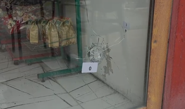 Në pamje shihen xhama të thyera dhe shenja plumbash në mure.