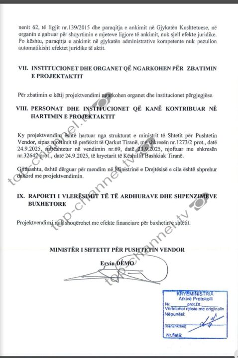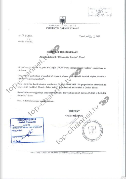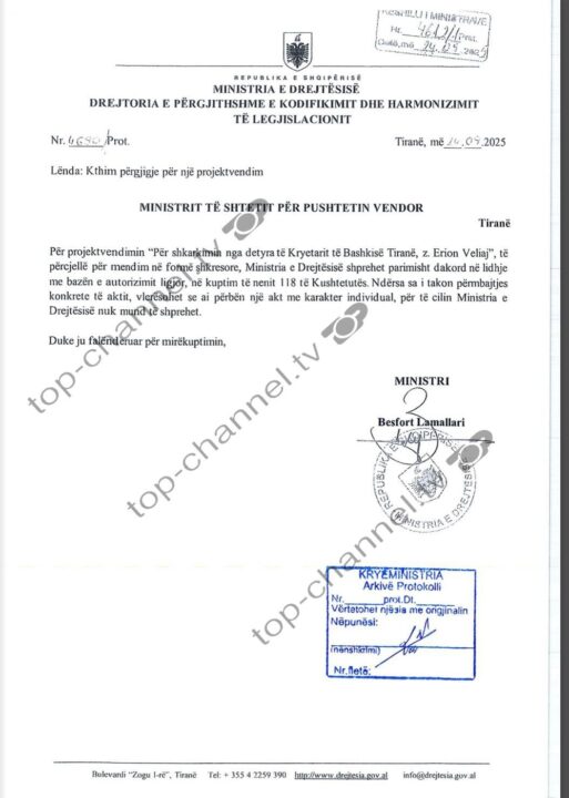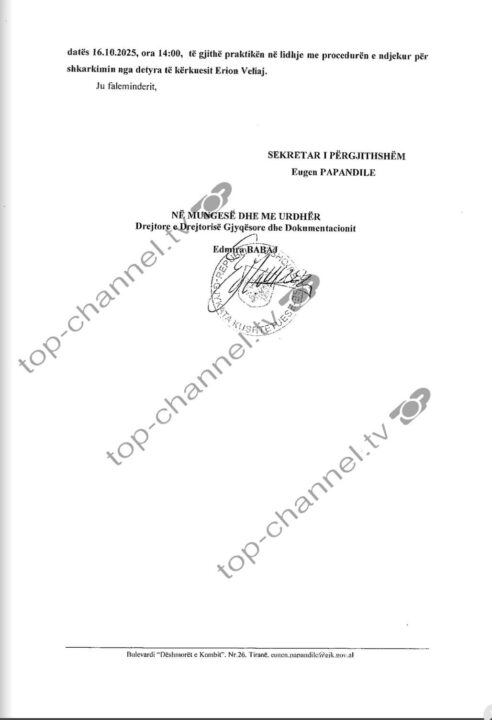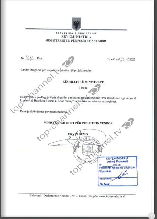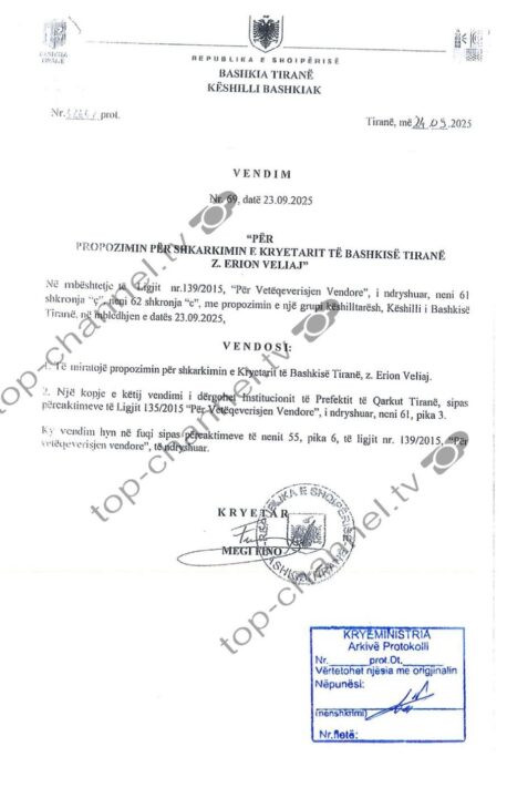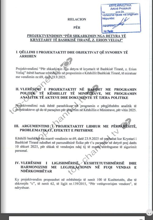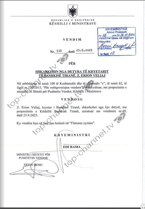 Dokumentacionit të dërguar në Kushtetuese i është bashkëngjitur edhe vendimi i shkarkimit nga Qeveria, që mban firmën e kryeministrit Edi Rama, si edhe pr.vendimi për shkarkimin në të cilin parashtrohen edhe argumentet që ka përdorur qeveria për të shkarkuar Veliajn nga detyra. Dokumenti është siguruar nga gazetari i Top Channel, Muhamed Veliu.