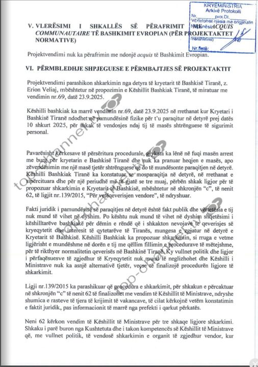 Sipas qeverisë ky ishte një akt formal, pasi shkarkimi i Erion Veliajt është iniciuar nga Këshilli Bashkiak i Tiranës, për shkak se Veliaj nuk u paraqit 3 muaj në detyrë për shkak të masës arrest me burg që prej datës 10 shkurt./ Top Channel