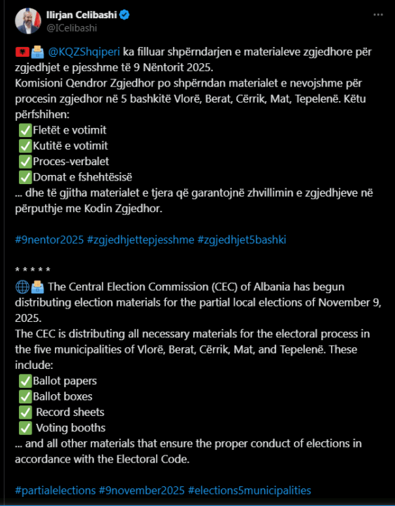 KQZ ka nisur shpërndarjen e materialeve zgjedhore për zgjedhjet e pjesshme të 9 Nëntorit 2025.