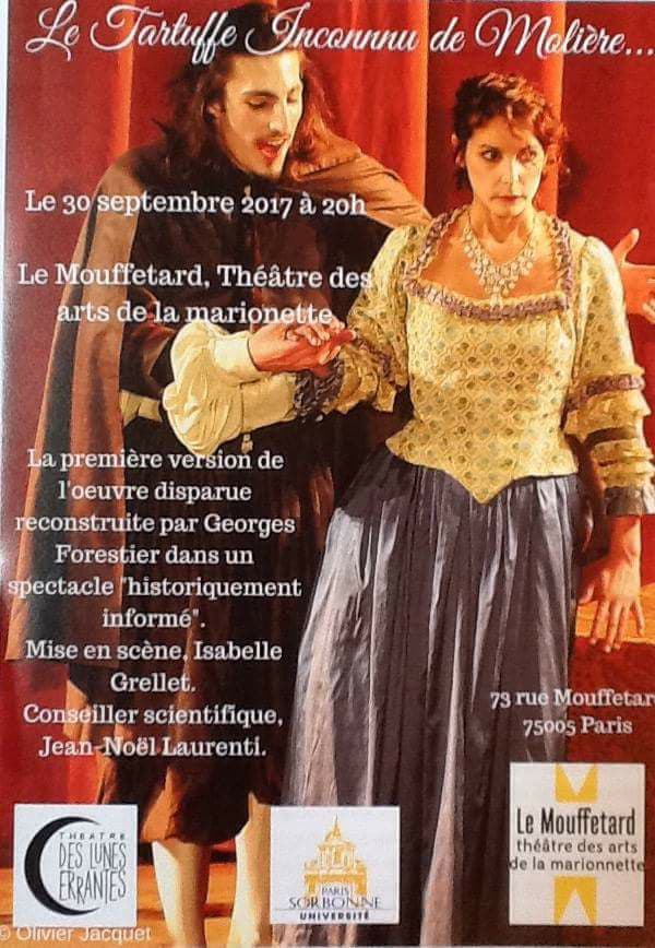 Ja një shfaqje teatrale ndryshe si të tjerat : Tartufi i Molierit, që edhe pse aq e njohur, e interpretuar gjatë disa shekujve, në shumë gjuhë të botës, e padyshim dhe në shqip, më së fundi u luajt në gjuhën e tij, në frëngjishten e vjetër, siç e fliste dhe shkruante ai në vitet 1600 dhe në versionin origjinal, në 3 akte, shfaqur para teatrit të Louis XIV, me 12 maj 1664, në teatrin mbretëror të Versailles. Louis XIV e donte shumë komedianin Molier dhe kjo pjesë e trupës së Molierit e argëtoi shumë, por ardhja e shpejtë e kryepeshkopit të Parisit, duke u ankuar për Molierin se në këtë vepër cënonte kishën dhe Zotin, mbreti më së fundi vendosi që shfaqjen ta ndalonte.