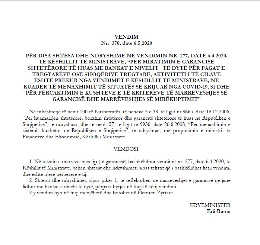 Në fletoren më të fundit zyrtare me anë të një VKM-je është rishikuar vendimin nr. 277, i 6 prillit për garancinë sovrane e parë sovrane ku vendoste në dispozicion të bankave të nivelit të dytë 11 miliardë në mënyrë që ato të jepnin kredi për bizneset e prekura nga masat kundër COVID-19, në mënyrë që subjektet të paguajnë punonjësit e tyre. Me një vendim të fundit të publikuar në fletoren zyrtare, qeveria merr përsipër të paguaj edhe normën e interesit për të gjithë kredimarrësit. Kredia do të jetë me normë interesi preferenciale dhe që nuk do të jetë më e lartë se 2.85%, dhe ndryshe nga vendimi i parë kur do të paguhej nga bizneset tashmë do të merret përsipër nga shteti, konkretisht nga Ministria e Financave.