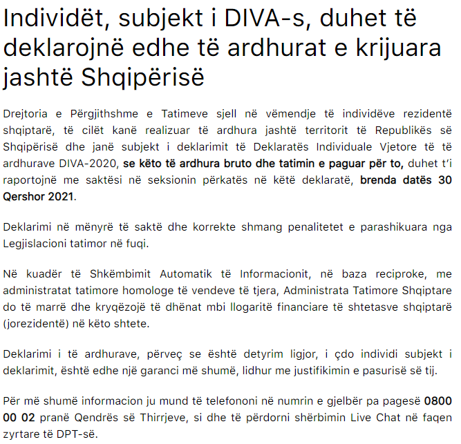 Drejtoria e Përgjithshme e Tatimeve ka njoftuar ditën e sotme se qytetarët rerzident në shqipëri dhe kanë bërë para jashtë territorit shqiptar huhet ti deklarojnë. Ajo shton më tej se janë subjekt i deklarimit të Deklaratës Individuale Vjetore të të ardhurave DIVA-2020, se këto të ardhura bruto dhe tatimin e paguar për to, duhet t’i raportojnë me saktësi në seksionin përkatës në këtë deklaratë, brenda datës 30 Qershor 2021.
