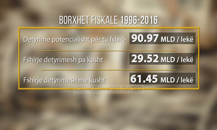 Në total, borxhi fiskal deri në fund të 2016-s është 172.5 miliardë lekë, kurse potenciali për t’u fshirë është rreth 91 miliardë lekë. Falja do t’i shtrijë efektet deri në vitin 2014.