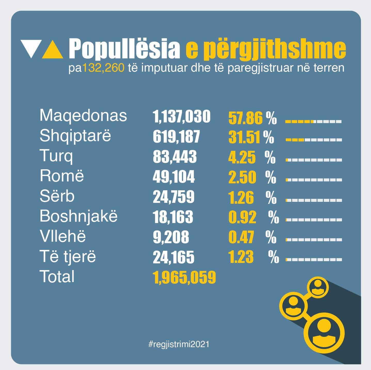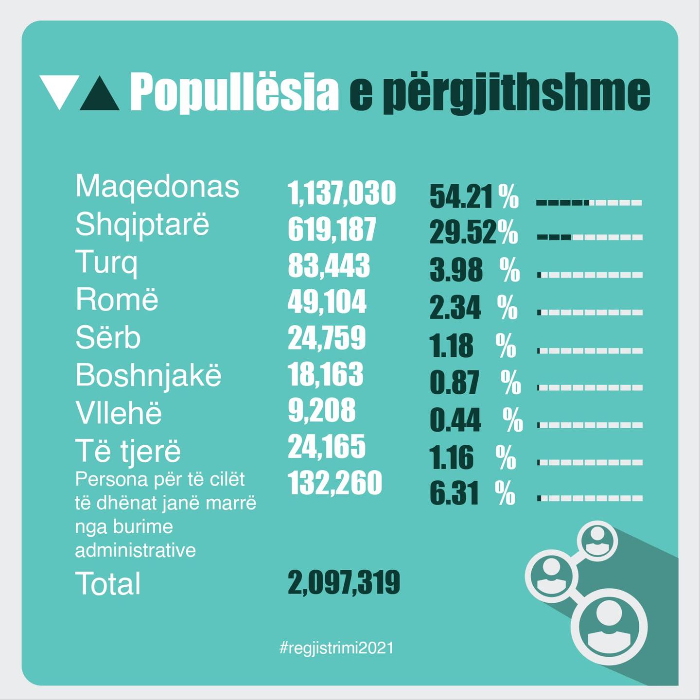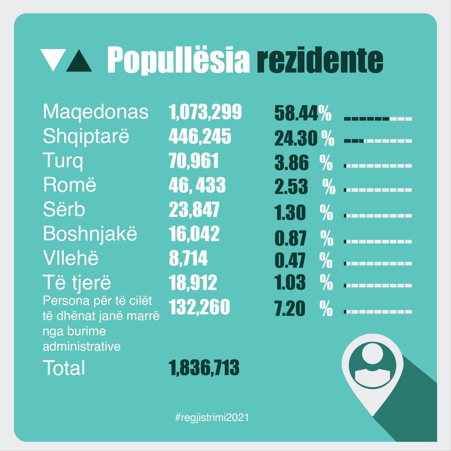 Enti Shtetëror i Statistikës të mërkurën më 30 mars, publikoi edhe numrin e përgjithshëm të popullsisë së regjistruar, që përfshin atë rezidente dhe jorezidente. Janë regjistruar gjithsej 2,097,319 persona dhe prej tyre; 54.21 për qind janë deklaruar maqedonas, 29.52 për qind shqiptarë, 3.98 për qind turq, 2.34 për qind nga komuniteti rom, 1.18 për qind si serbë, 0.98 boshnjakë dhe 0.44 vllehë.