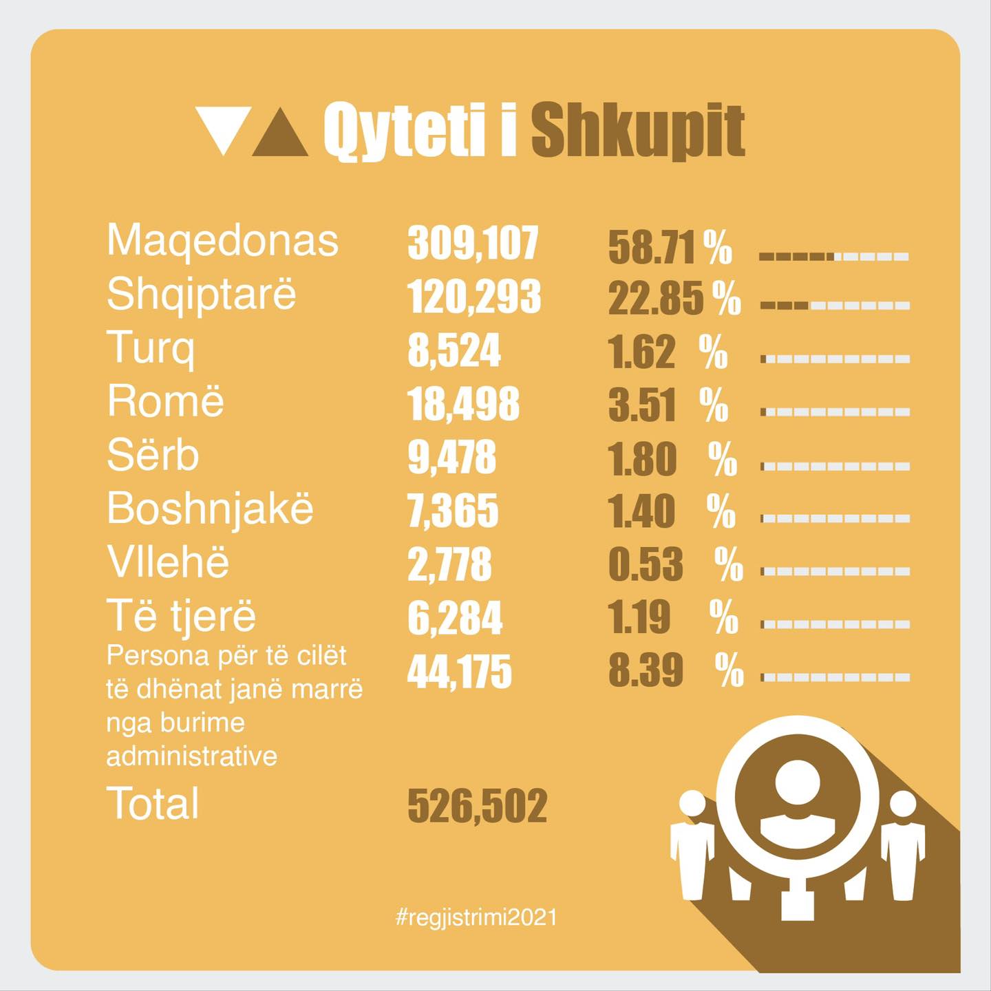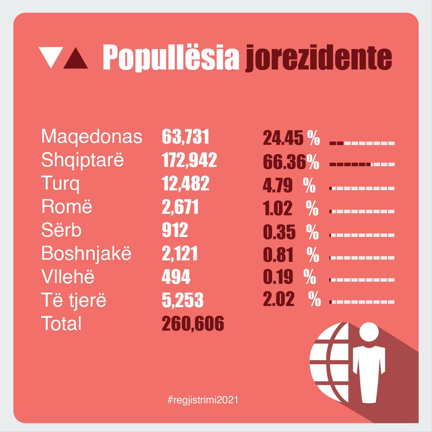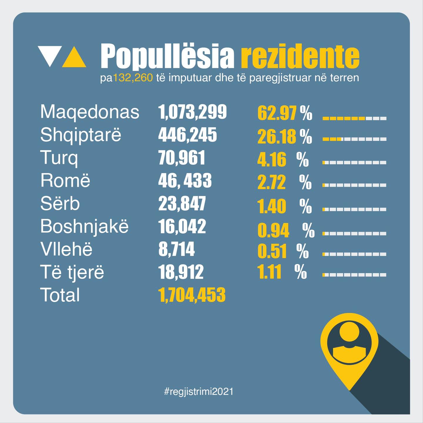 Enti Shtetëror i Statistikës të mërkurën më 30 mars, publikoi edhe numrin e përgjithshëm të popullsisë së regjistruar, që përfshin atë rezidente dhe jorezidente. Janë regjistruar gjithsej 2,097,319 persona dhe prej tyre; 54.21 për qind janë deklaruar maqedonas, 29.52 për qind shqiptarë, 3.98 për qind turq, 2.34 për qind nga komuniteti rom, 1.18 për qind si serbë, 0.98 boshnjakë dhe 0.44 vllehë.