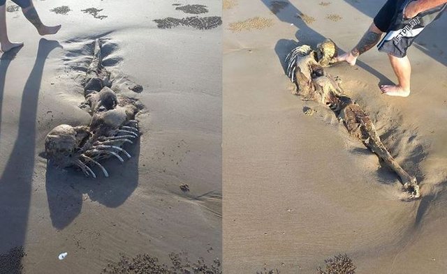 Fotet e një skeleti te çuditshëm, të dalë në breg të detit janë duke bërë xhiron e rrjetit.