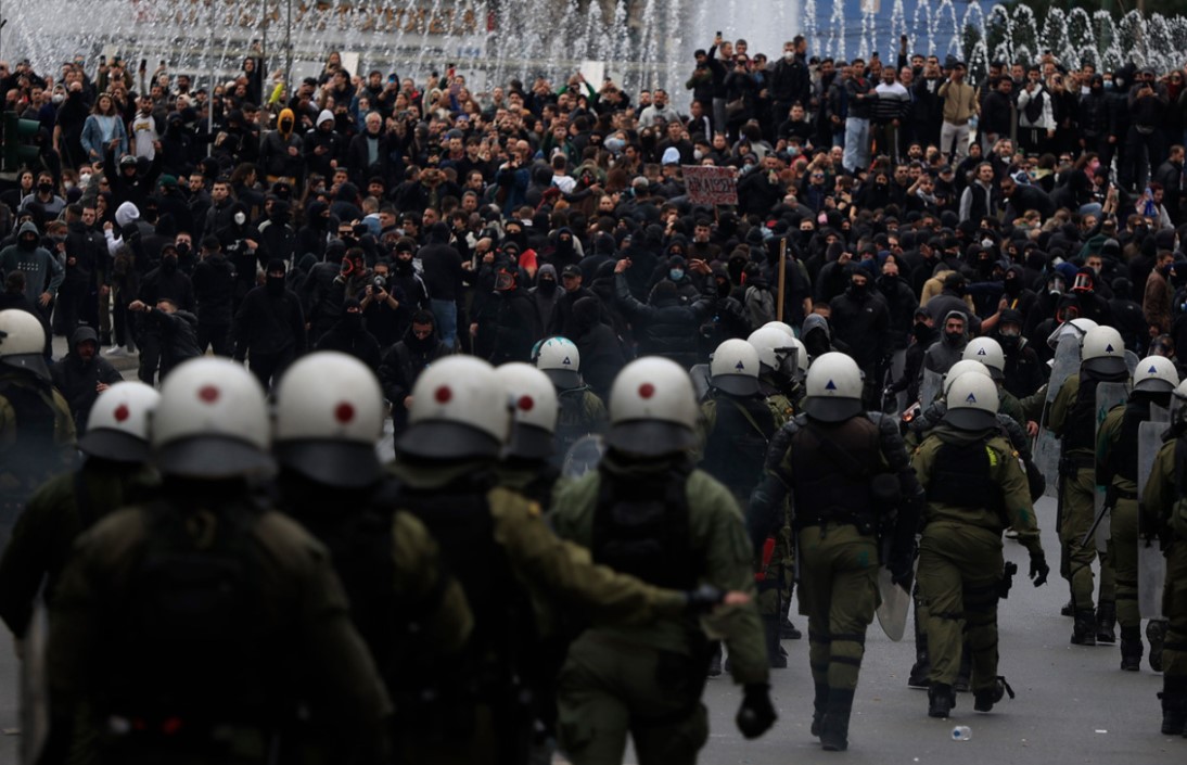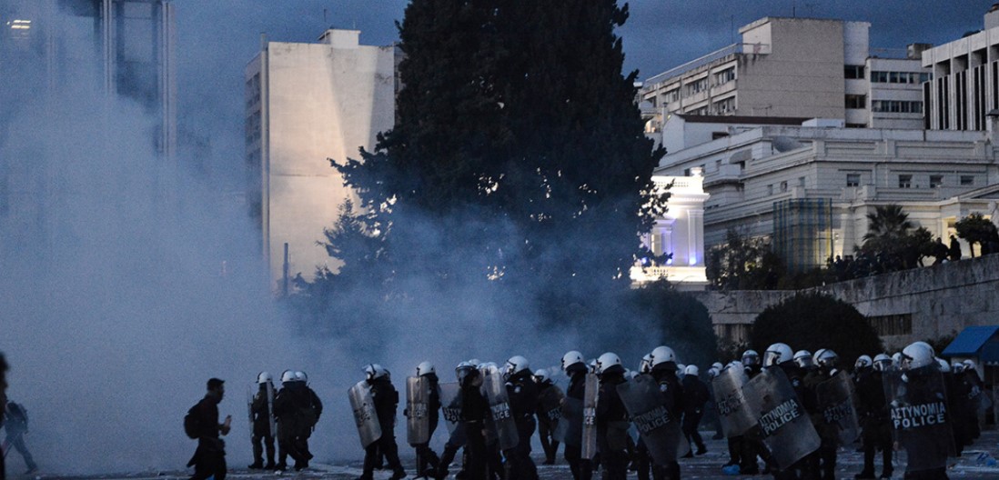 Sulmuesit me kapuç i shtynë protestuesit për të sulmuar policinë, e cila u përgjigj me gaz lotsjellës. Përplasja, fillimisht e kufizuar në një cep të sheshit Sintagma, u përhap brenda pak minutash në rrugët përreth, ndërsa bombat me benzinë ranë në rrugën Vasilissis Sofias dhe rrugë të tjera pranë sheshit.