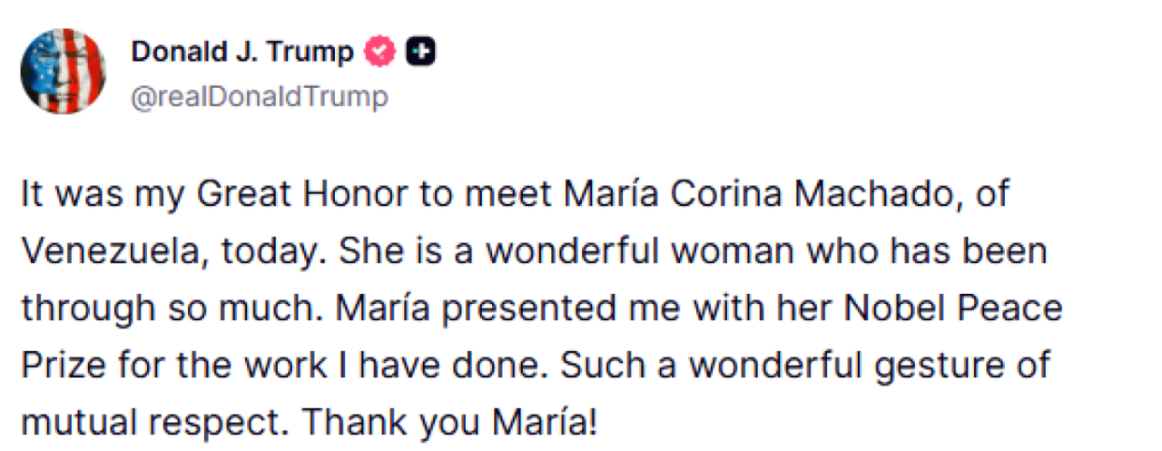“Ishte një nder i madh të takoja sot María Corina Machadon nga Venezuela. Ajo është një grua e jashtëzakonshme që ka kaluar shumë vështirësi. María më ofroi Çmimin e saj Nobel për Paqe për punën që kam bërë. Një gjest kaq i bukur respekti të ndërsjellë. Faleminderit, María!”, tha ai.