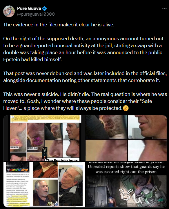 Vdekja e Jeffrey Epstein dhe rrethanat e saj, e ndjekur nga skandale që përfshinin figura të njohura botërore, kanë nxitur një valë të madhe teorish konspirative në internet. Më e përhapura ndër to është pretendimi se pedofili i dënuar është “ende gjallë”, pas dosjeve të fundit të publikuara nga Departamenti i Drejtësisë së SHBA-së. Disa përdorues të mediave sociale pretendojnë madje se e kanë parë atë personalisht.