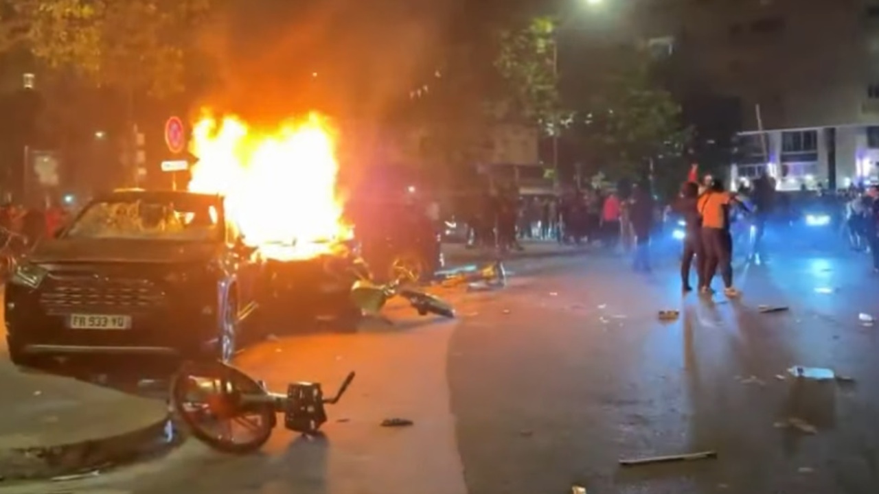 Por gëzimi në rrugët e Parisit u kthye shpejt në kaos: më shumë se 130 persona janë arrestuar, disa dyqane janë plaçkitur dhe makina janë djegur.