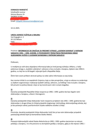 Gazetari investigativ Domagoj Margetiq ka dorëzuar një raport të detajuar në Zyrën e Prokurorit Publik të Milanos, në kuadër të hetimeve që autoritetet italiane po kryejnë mbi të ashtuquajturat “safari njerëzore” gjatë rrethimit të Sarajevës (1992–1994). Hetimet lidhen me pretendimet se individë të pasur nga Italia dhe vende të tjera kanë udhëtuar drejt Bosnjës së kohës së luftës për të marrë pjesë në vrasjen e civilëve si formë “gjuetie”.