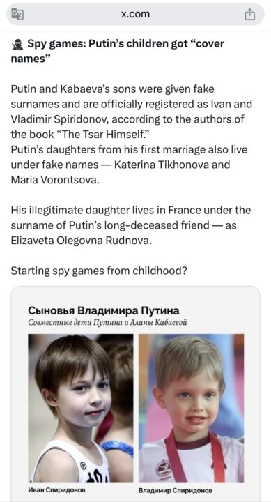 “New York Post” raporton se Vladimir Putin ka ngritur një mburojë për dy djemtë nga frika se mos vriten. Për këtë arsye, dy fëmijët dhe nëna e tyre thuhet se jetojnë në një kompleks pyjor të fortifikuar në Valdai, në veriperëndim të Moskës. Djemtë përdorin gjithashtu pseudonimin Spiridonov si mbiemrin e tyre. “Informacioni rreth [Kabaevës] dhe fëmijëve të saj është fshirë nga bazat e të dhënave shtetërore, djemve u është dhënë një pseudonim – Spiridonov, dhe e gjithë zona përreth rezidencës familjare të Putinit në Valdai është nën siguri të rreptë”, sipas gazetarëve Roman Bananin dhe Mikhail Rubin.