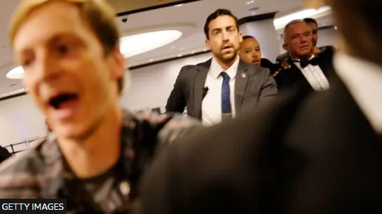 “Drejtori i FBI-së, Kash Patel, ishte ulur pranë meje”, thotë korrenspondenti i BBC Bernd Debusmann Jr. Një agjent kaloi mbi disa tavolina për të folur me të, përpara se ta evakuonte me shpejtësi nga vendi.