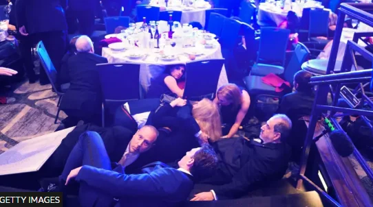 Mediat e huaja shkruajnë se, Trump u shoqërua menjëherë jashtë sallës nga agjentët e Shërbimit Sekret. Pak më pas, edhe zyrtarë të lartë të administratës, përfshirë Sekretarin e Mbrojtjes Pete Hegseth, u evakuuan nga trupat e tyre të sigurisë.