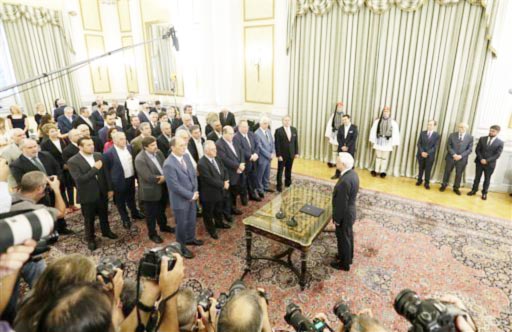 Në një ceremoni zyrtare të zhvilluar dje në mesditë në dy pjesë në Athinë, është betuar “Qeveria 2” e kryesuar nga Kryeministri grek, Aleksis Cipras, brenda 9 muajve të fundit. Pas betimit të vetë Kryeministrit dy ditë më parë në Presidencë, dje janë parë në fillim duke u betuar tradicionalisht me dorën mbi Bibël, 12 anëtarë të kabinetit të ri, e më pas 33 të tjerët, që kanë preferuar të kryejnë vetëm betimin zyrtar. Emërimi i kabinetit të ri në Greqi nuk ka pasur surpriza dhe Cipras, sipas analistëve, me zgjedhjen e tij ka siguruar huadhënësit se do të vazhdojë të respektojë marrëveshjen e ndihmës dhe do të zbatojë reformat.