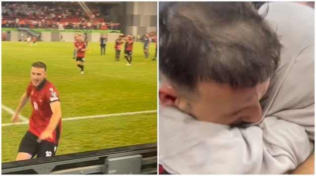 Mbrojtësi i kombëtares Ardian Ismaili menjëherë pas fitores është afruar tek tifozët për të përqafuar të ëmën.