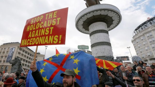 Protestuesit kanë mbajtur flamuj dhe janë mbledhur afër statujës së Aleksandrit të Madh, duke brohoritur dhe thirur, “Ne jemi maqedonë”.
