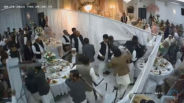 Kjo është një moment tronditës kur të ftuarit zihen ke me njëri-tjetrin, duke përfunduar të gjakosur. Një video që po qarkullon në rrjetet sociale tregon të ftuarit teksa goditen me grushta dhe karrige me njëri-tjetrin.