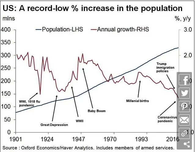 Hera e fundit që popullsia amerikane u rrit me një ritëm kaq të ngadaltë ishte më shumë se një shekull më parë, kur rreth 675,000 amerikanë vdiqën nga gripi spanjoll. Atë vit, popullsia e vendit u tkurr me 0.1 përqind.