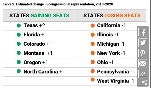 Byroja e Regjistrimit njoftoi në prill se Nju Jorku dhe Kalifornia janë midis shtatë shteteve që secili do të humbasë një rreth kongresi sipas numërimit të ri.