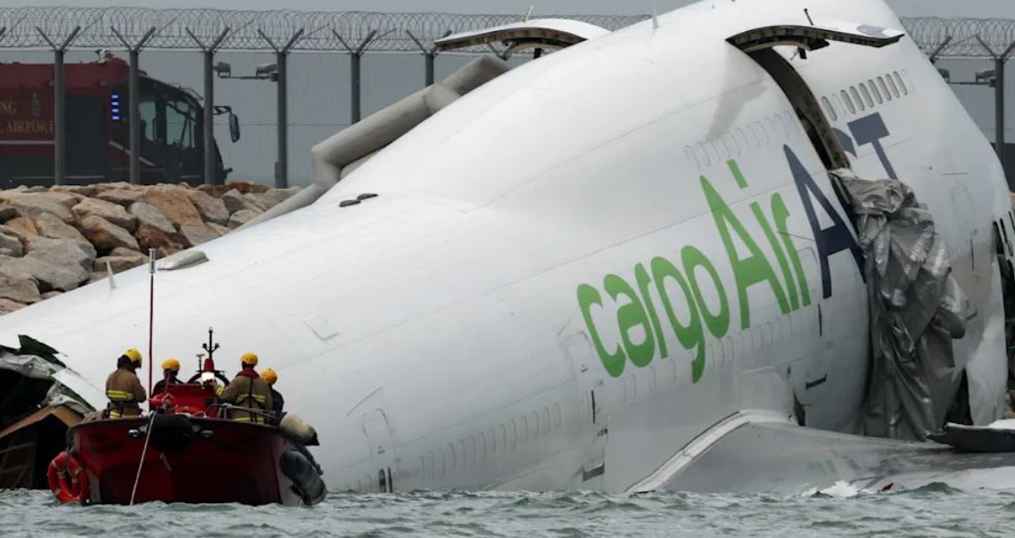 Një avion mallrash Boeing 747 rrëshqiti nga pista dhe u rrëzua në det në Aeroportin Ndërkombëtar të Hong Kongut të hënën në mëngjes, duke vrarë dy punonjës të sigurisë së aeroportit, automjeti i patrullës së të cilëve u godit nga avioni jashtë kontrollit.