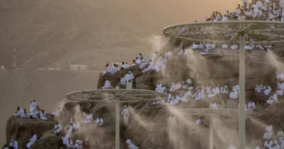 Disa falen, duke pëshpëritur lutjet e tyre për Zotin me pëllëmbët e hapura drejt qiellit. Disa shijojnë panoramën ndërsa drita e mëngjesit fillon të përhapet. Të tjerë ngrenë krahët për të bërë një fotografi selfie për të shënuar momentin. Spërkatëse të mëdha në formë rrethore hedhin ujë për të freskuar pelegrinët në vapën që shkon me shpejtësi në 45 gradë Celcius.