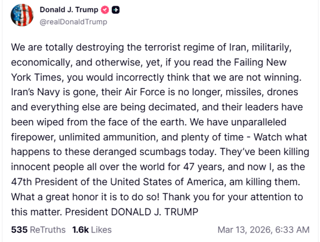“Shikoni çfarë u ndodh sot këtyre kopilëve të çmendur. Ata kanë vrarë njerëz të pafajshëm në të gjithë botën për 47 vjet, dhe tani unë, si Presidenti i 47-të i Shteteve të Bashkuara të Amerikës, i vras ata. Çfarë nderi i madh ta bëjmë këtë!”, shkroi presidenti amerikan në mënyrë karakteristike. Ne po e shkatërrojmë plotësisht regjimin terrorist të Iranit, ushtarakisht, ekonomikisht dhe në çdo mënyrë tjetër, por nëse lexoni New York Times-in e dështuar, do të mendoni gabimisht se nuk po fitojmë. Marina e Iranit është zhdukur, forca e tij ajrore është zhdukur, raketat, dronët dhe gjithçka tjetër është shkatërruar, dhe udhëheqësit e tij janë zhdukur nga faqja e dheut. Ne kemi fuqi zjarri të pakrahasueshme, municione të pakufizuara dhe shumë kohë. Shikoni çfarë u ndodh sot këtyre kopilëve të çmendur. Ata kanë vrarë njerëz të pafajshëm në të gjithë botën për 47 vjet dhe tani unë, si Presidenti i 47-të i Shteteve të Bashkuara të Amerikës, po i vras ata. Çfarë nderi ta bëj këtë! Faleminderit për vëmendjen tuaj ndaj kësaj çështjeje. President DONALD TRUMP“, përfundoi postimin e tij presidenti amerikan.