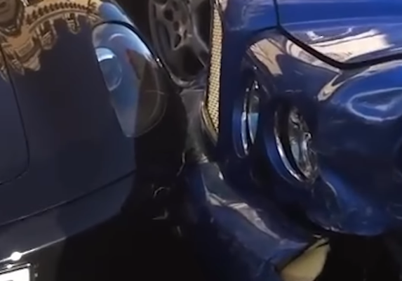 Në një video të postuar në internet, shihet shoferja në një makinë ngjyrë blu që përplaset me katër makinat e shtrenjta, duke shkaktuar panik dhe zhurmë të madhe.