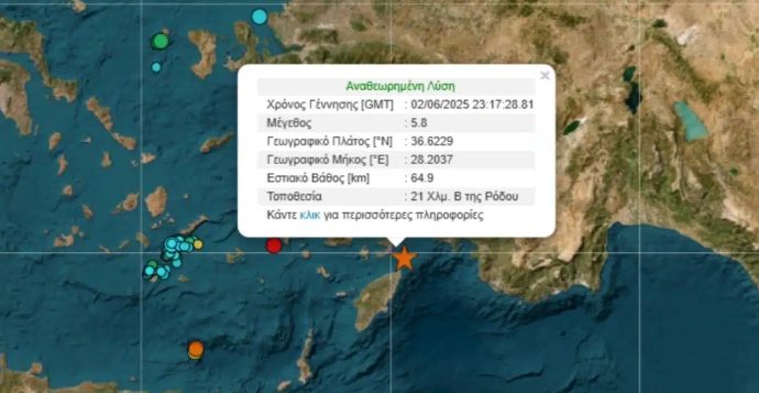 Një tërmet i fortë me magnitudë 5.8 ballë të shkallës Rihter është regjistruar në orën 02:17 pas mesnatës me orën lokale, në zonën detare midis Rodosit dhe Turqisë.