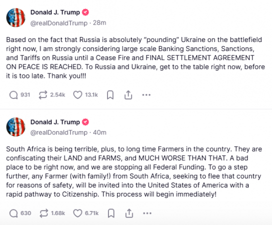 “Duke u bazuar në faktin se Rusia po ‘godet’ Ukrainën në fushën e betejës tani, unë po shqyrtoj me forcë sanksione të mëdha bankare, sanksione dhe tarifa ndaj Rusisë derisa të arrihet një armëpushim dhe një marrëveshje përfundimtare për paqen. Për Rusinë dhe Ukrainën, uluni tani në tavolinën e bisedimeve, para se të jetë vonë.”