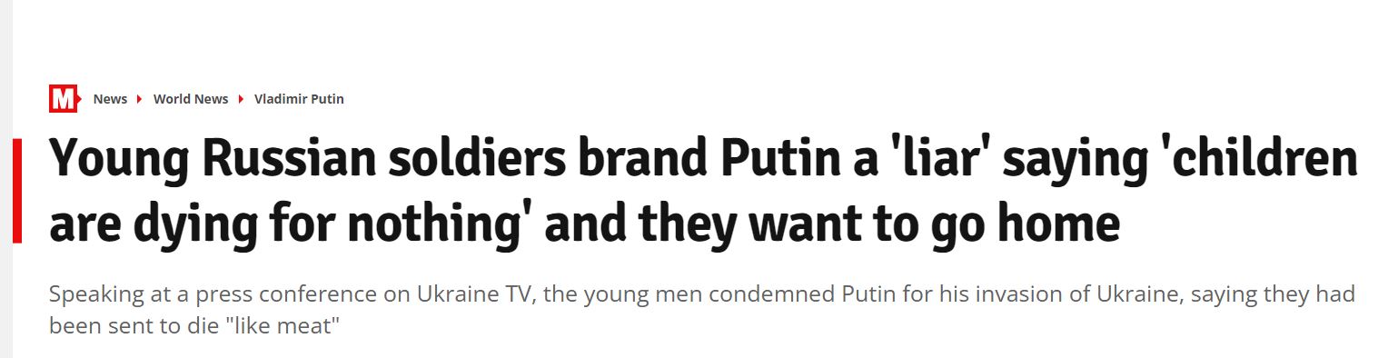 Ushtarët rusë të kapur rob në Ukrainë i kanë kërkuar popullit të tyre të ngrihen kundër Vladimir Putinit, ndërsa paralajmërojnë kolegët e tyre ushtarë se po hidhen në varre masive. Grupi i ushtarëve kanë folur për një konferencë për shtyp në agjencinë e lajmeve Interfax-Ukraine.