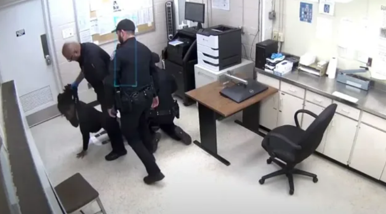 Polici fillimisht e gjuan me grusht në fytyrë të burgosurin dhe e hedh në dysheme. Më pas një tjetër oficer e mban të arrestuarin të mos lëvizë dhe ia godasin kokën në dysheme.