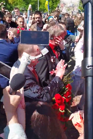 Siç shihet në video ambasadori rus duket se është i vendosur në qëndrimin e tij, edhe pse vijon të ngjyroset me bojë të kuqe qëndron i palëvizur.