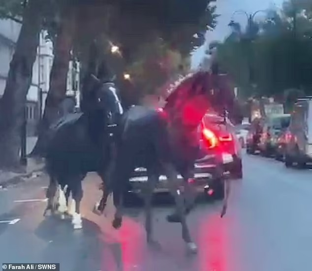 Kafshët të cilat dyshohet se janë pjesë e kalorësisë mbretërore u panë teksa ecnin të hutuar dhe të frikësuar mes makinave, që kishin ngecur në trafik. Ata përpiqeshin të gjenin një rrugëdalje, ndërsa nuk e ndalnin galopimin e tyre.