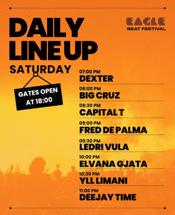 Dyert e festivalit do të hapen në orën 18:00, një mundësi për ju që të eksploroni vendin dhe të qetësoheni me miqtë. Në orën 19:00 vjen dhe performanca e parë e mbrëmjes nga Dexter, ndërsa në orën 20:00 vjen Big Cruz. Në orën 20:30 do të keni mundësi të shijoni performancën e Capital T, ndërsa në orën 21:00 do të kërceni me këngët e Fred De Palma.