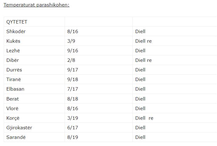 Moti parashikohet i kthjellët në pjesën më të madhe të territorit pa përjashtuar vranësirat mesatare dhe hera-herës deri të dendura kalimtare në relievet malore në lindje.